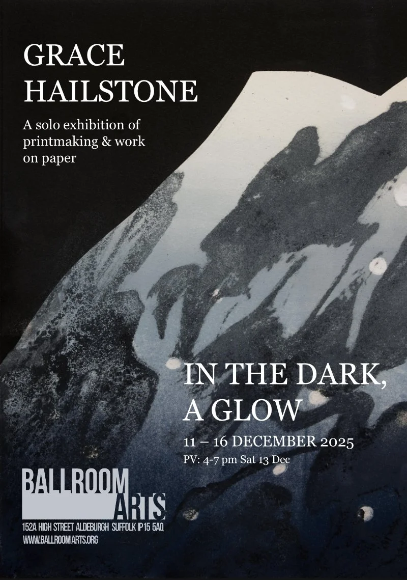 ‘In the Dark, a Glow’ is Grace’s first solo exhibition, taking place at the Ballroom Arts Courtyard Gallery, Aldeburgh, Suffolk from 11- 16th December 2025.’ The exhibition features a new body of work exploring the interconnectedness of nature, deep time and our inner worlds.
